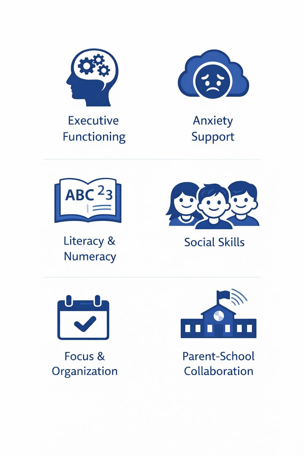 We do not provide traditional tutoring. Our focus is on rebuilding the underlying developmental skills that impact learning — including executive functioning, emotional regulation, focus, organisation and confidence.
